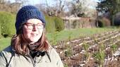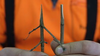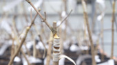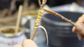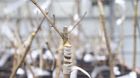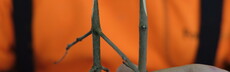 Nun wird eine Unterlage ausgewählt, die möglichst dieselbe Stärke wie der angeschnittene Edelreis hat. Die Schnittstellen von Edelreis und Unterlagen müssen später genau aufeinander passen, sodass das Kambium jeweils direkten Kontakt miteinander hat.